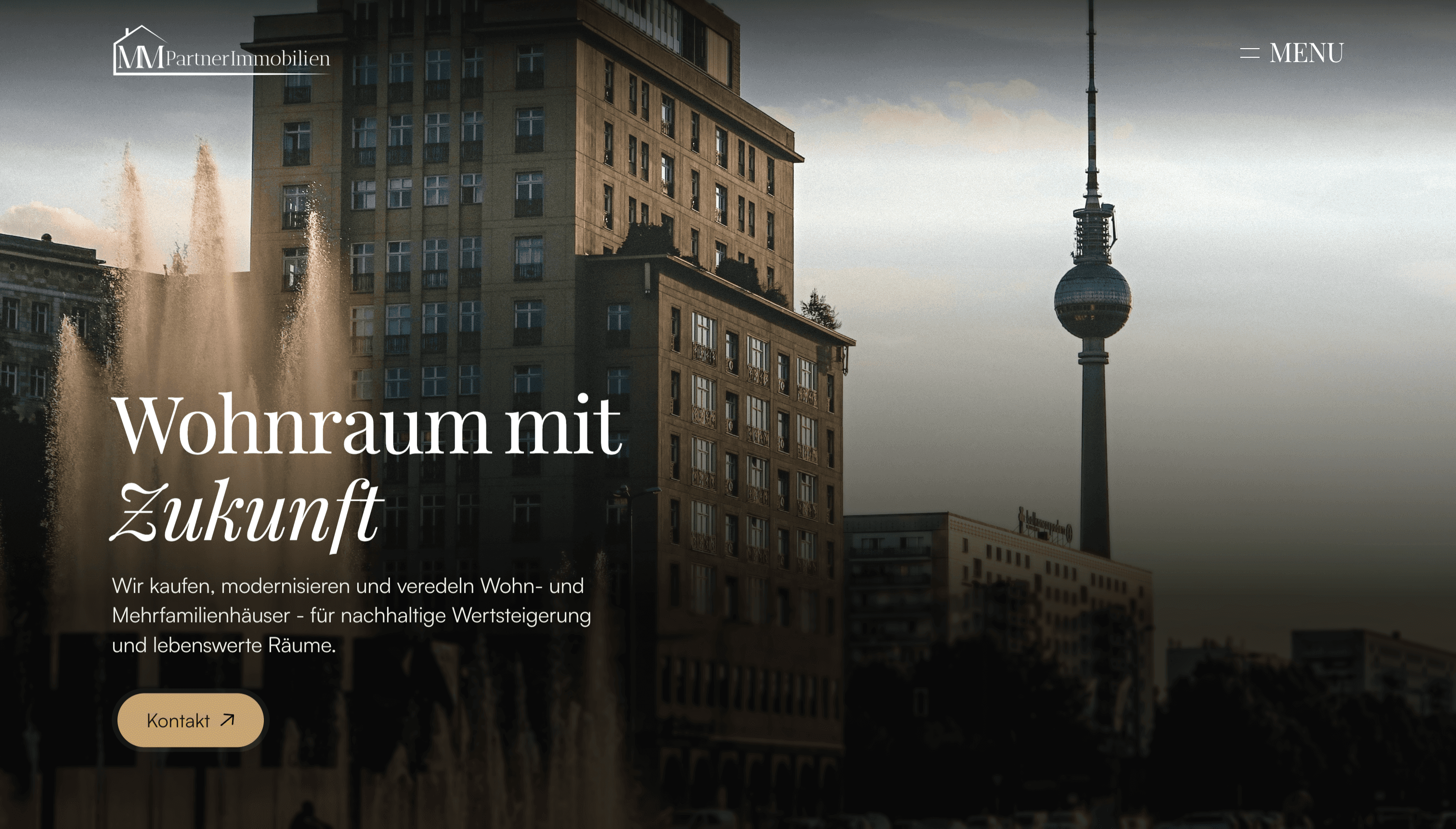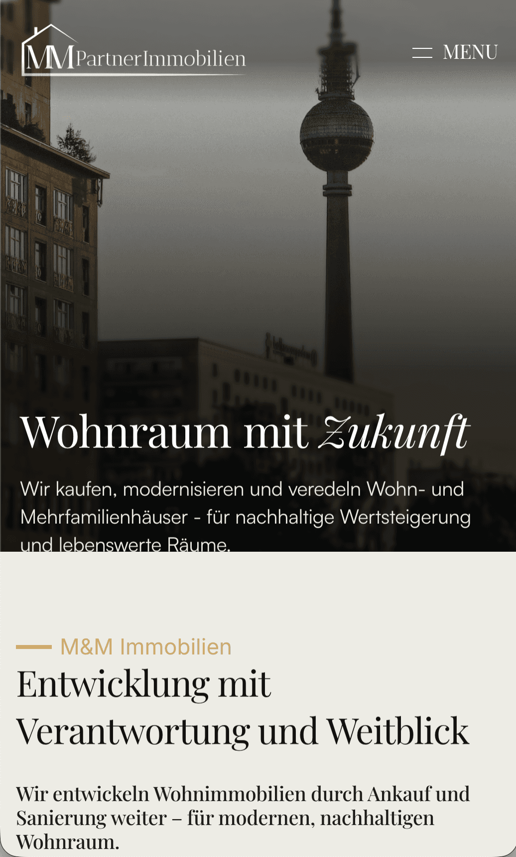 Konzeption des Webauftritts für M&M Partner Immobilien. Das Ziel war es, die regionale Kompetenz und Seriosität des Maklerbüros digital spürbar zu machen. Durch ein modernes, aufgeräumtes Design und emotionale Bildsprache wird das Vertrauen potenzieller Eigentümer und Käufer sofort gestärkt.